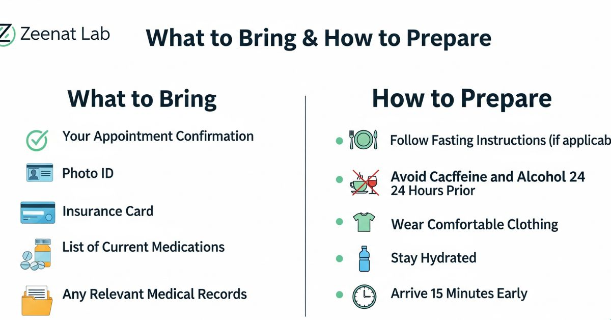 You should bring your requisition or doctor’s form when going to Zeenat Lab. Valid photo ID helps. Phone number or email for reports matters because many labs send SMS or email updates. For fasting tests, avoid food or drink (except water) for 8-12 hours before sample collection.